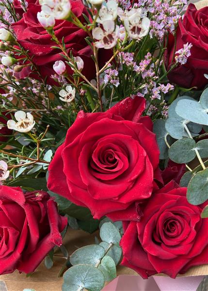 Beautiful Ecuadorian red roses are elegantly hand-tied with delicate filler flowers and fragrant eucalyptus foliage. Arranged in an aqua pack and presented in a luxury presentation box, this bouquet is a timeless expression of romance.
