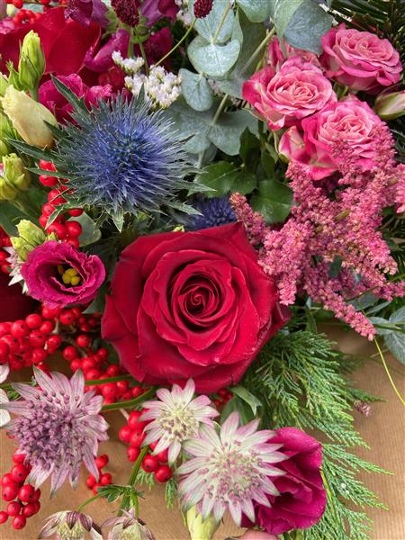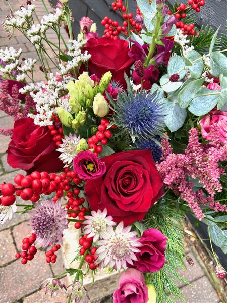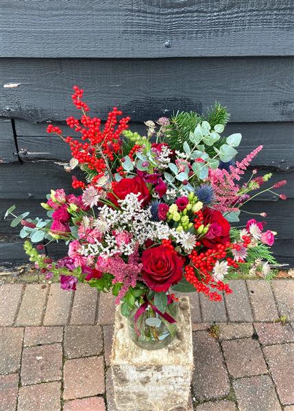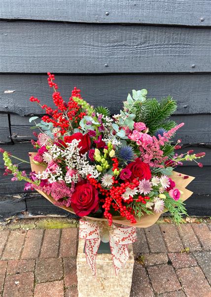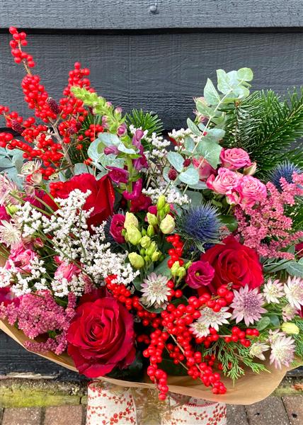This luxurious bouquet captures the essence of the festive season with lush red roses, Ilex berries and velvety blooms paired with seasonal foliage. The perfect gift to celebrate the season, it brings warmth, beauty, and a touch of glamour to any winter celebration.
