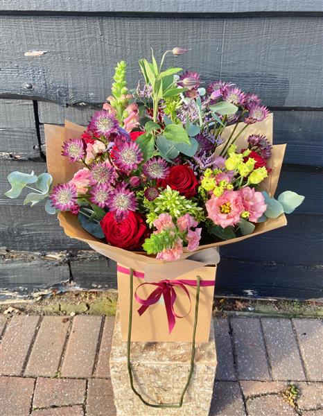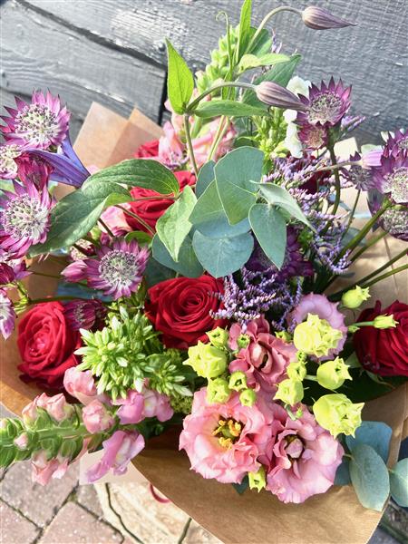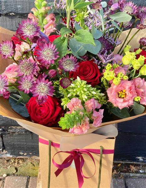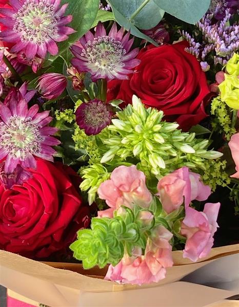 Lush, velvety Red Roses and charming romantic flowers, beautifully hand-tied to create this heartfelt bouquet. Please allow 2 days notice for this bouquet or call us to check we have stock of Red Roses.