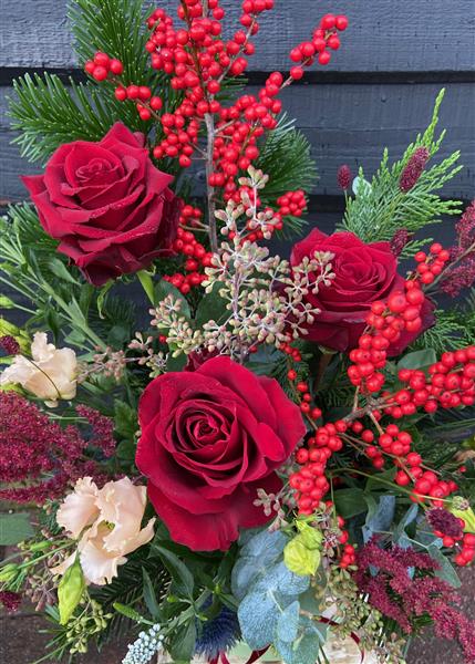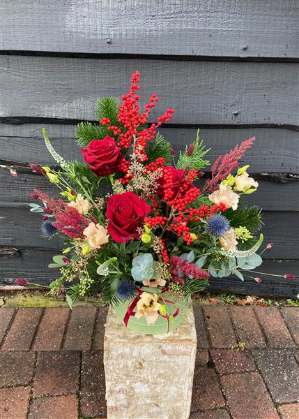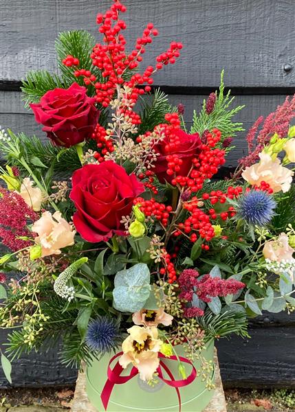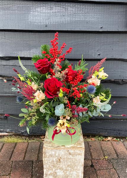 Celebrate the season in style with this front facing festive floral hat box arrangement. Rich red roses, vibrant festive berries, elegant seasonal florals and lush foliage, it captures the warmth and elegance of the holidays. Perfect as a gift or a statement piece in your home, this arrangement brings festive cheer, sophistication, and timeless beauty to any space.