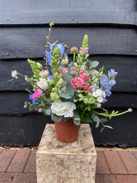 A delightful selection of fresh, seasonal flowers arranged in a terracotta pot — a perfect gift for Mother's Day.