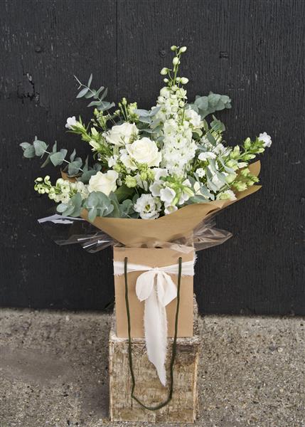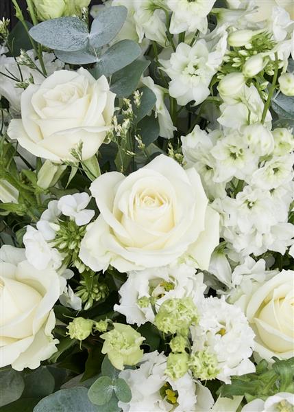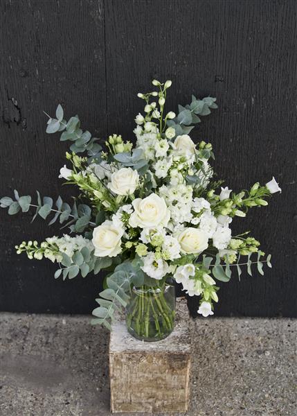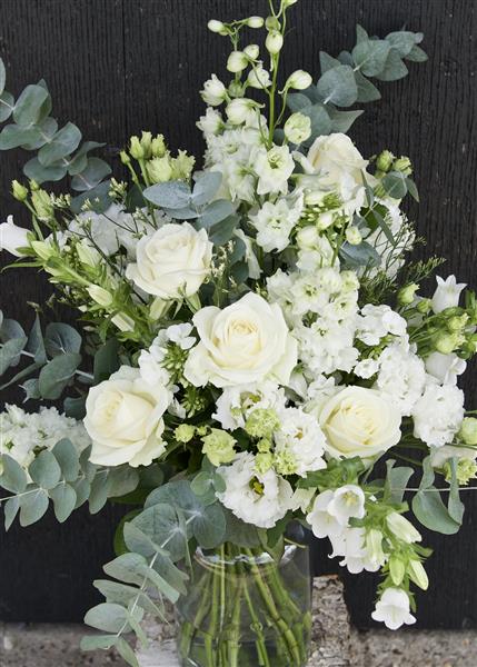 Hand picked white florals with lush green foliage create this classic design of graceful elegance.