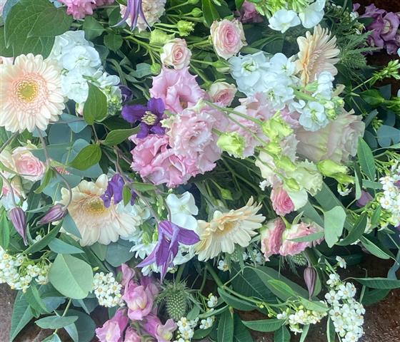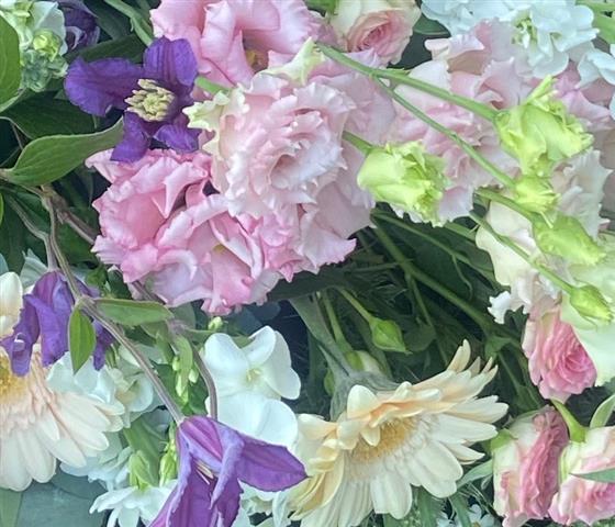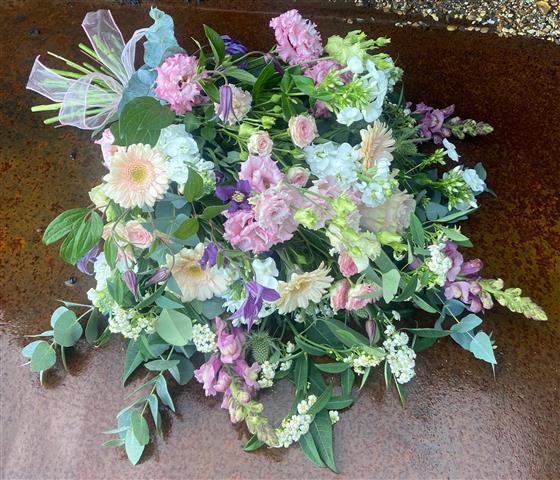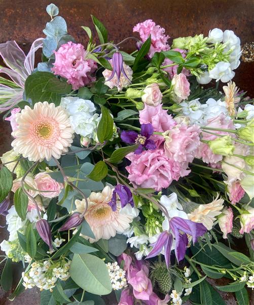 A delicate blend of pastel blooms in soft pinks, lilacs, and whites, beautifully hand-tied into a natural sheaf.