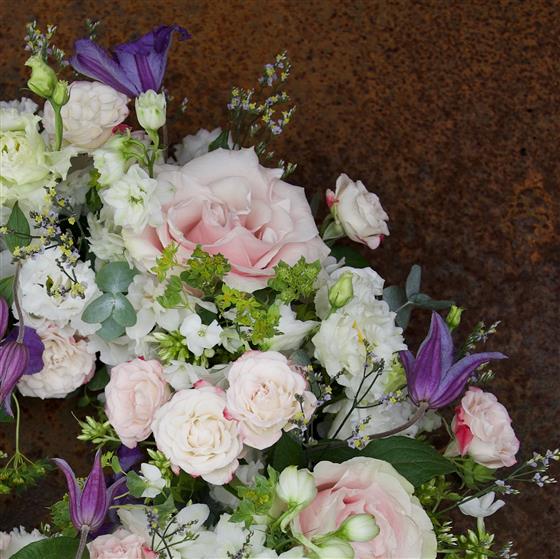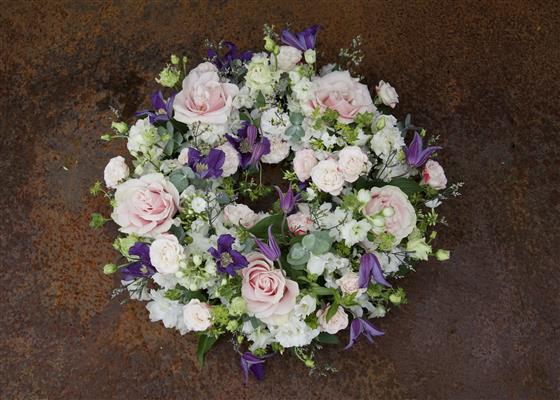 Delicate pastel flowers with greenery, forming a graceful wreath full of gentle colour and beauty.
