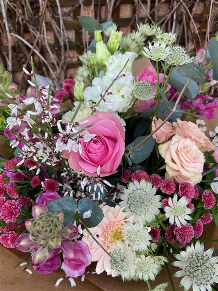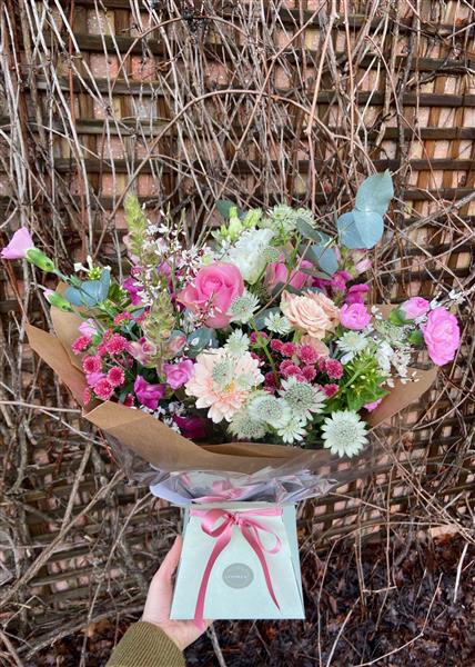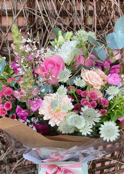 A beautifully romantic bouquet of delicate pink flowers including Roses and Ranunculus, along with other seasonal fresh flowers. Hand-tied and finished with an aqua pack and elegant presentation box.