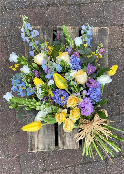 A colourful mix of spring flowers arranged as a natural tied sheaf. Flowers include Delphinium, Stocks, Tulips and Ranunculus with other seasonal flowers to complement. This design is beautifully fragrant and full of texture.