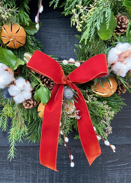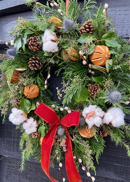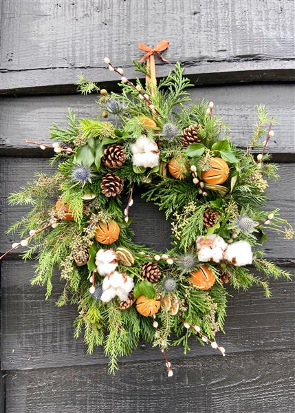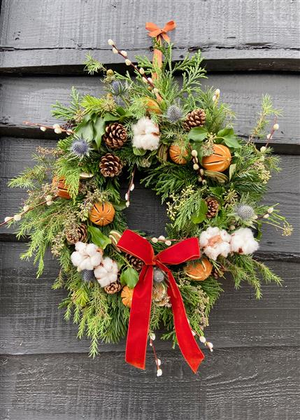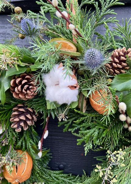 This handcrafted moss-based wreath combines the gentle textures of dried cotton and pussy willow with fragrant dried fruit, blue Eryngium, natural pinecones and lush seasonal mixed foliage. Its neutral tones and organic design bring a calming, rustic charm to any home, making it a timeless piece that transitions beautifully from season to season.