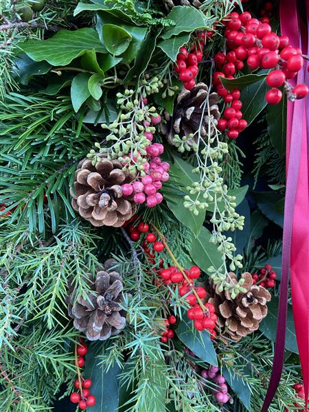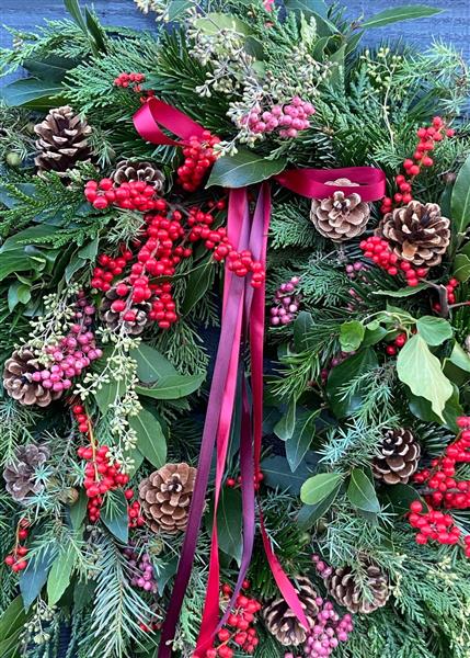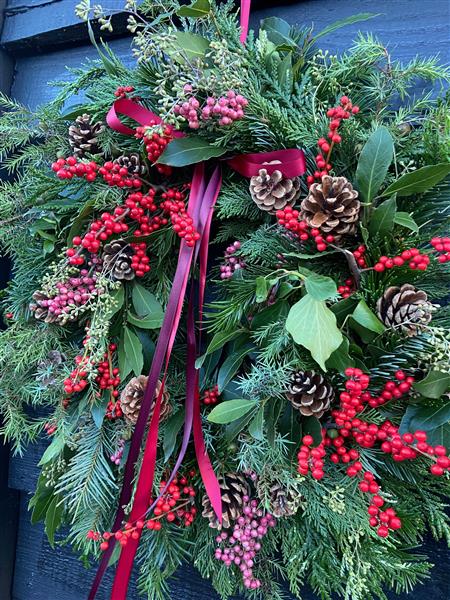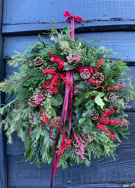 Rich in texture and colour, this moss-based wreath features abundant seasonal greenery, vibrant Ilex berries, dried Pepperberries, and natural pinecones.