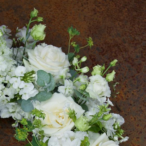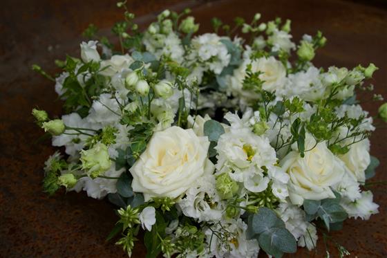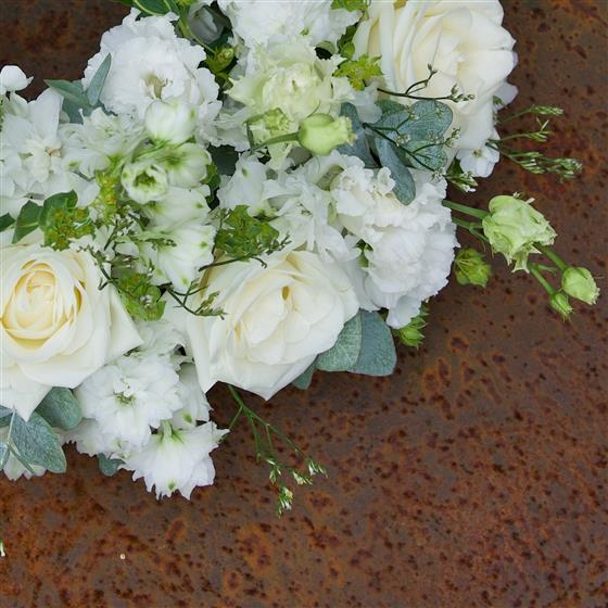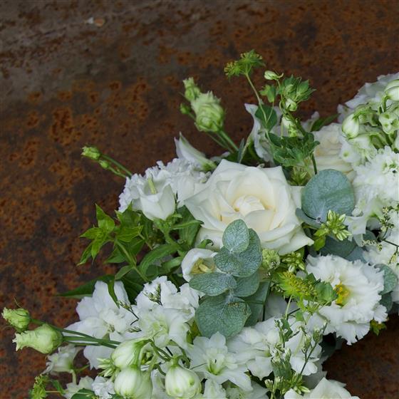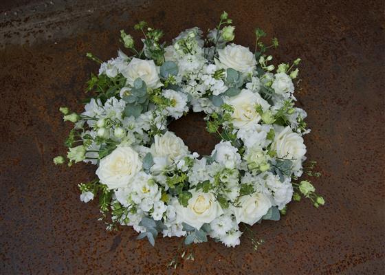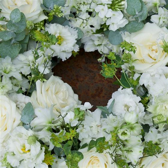 A hand-crafted wreath of white flowers and greenery, offering a timeless and elegant tribute.
